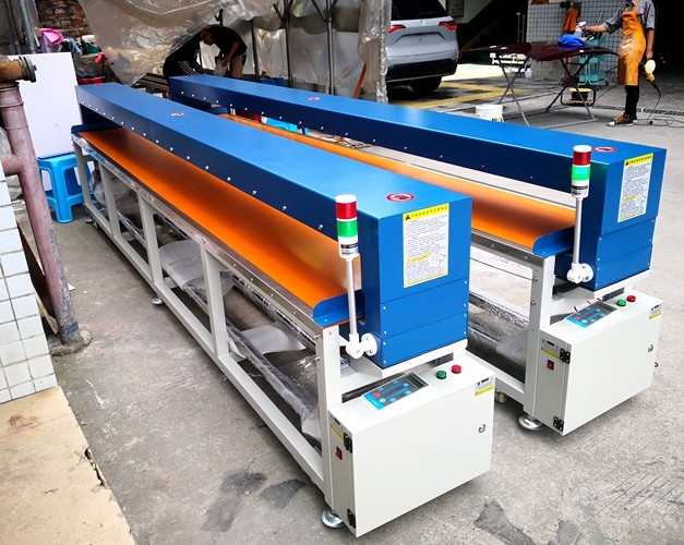 安装好后的宽幅龙门式检针机,立马就找出了很多细小的金属屑。要求0.8mm时,真的可以检出很多铁锈铁屑。报警率很高的。因此我们给景威提出要求其在检针机前端加装磁铁。以减少可能掉入棉中的金属屑。