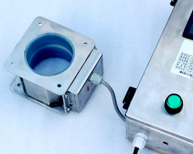 原料从料斗或送料器自由下落进入金属分离器,如果没有金属杂质,原料会直接通过金属分离器流向下端的出料口。如果检测器检测到原料中含有金属,那么控制器立刻启动分离板将金属物和部分原料一起导向侧面的排料口,然后分流板迅速恢复至正常的位置,分流板速度可调,金属分离器的检测精度也可根据生产需要调节,最小可检测并分离出Φ 0.2mm的金属颗粒。